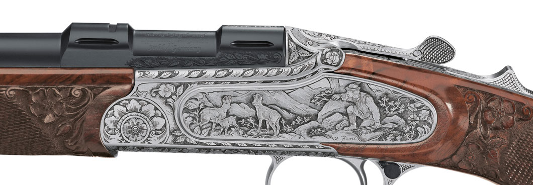 Long side plates, complex relief engraving with up to four animals per side, animal on the bottom sublimely chiselled. Filling and ornaments of your own choice. Barrel breach fully engraved with gold boarder; gold plated triggers. Stock made from highest grade luxury walnut root wood with strong wood graining, high end stock carving. Silver pistol grip cap with monogram.