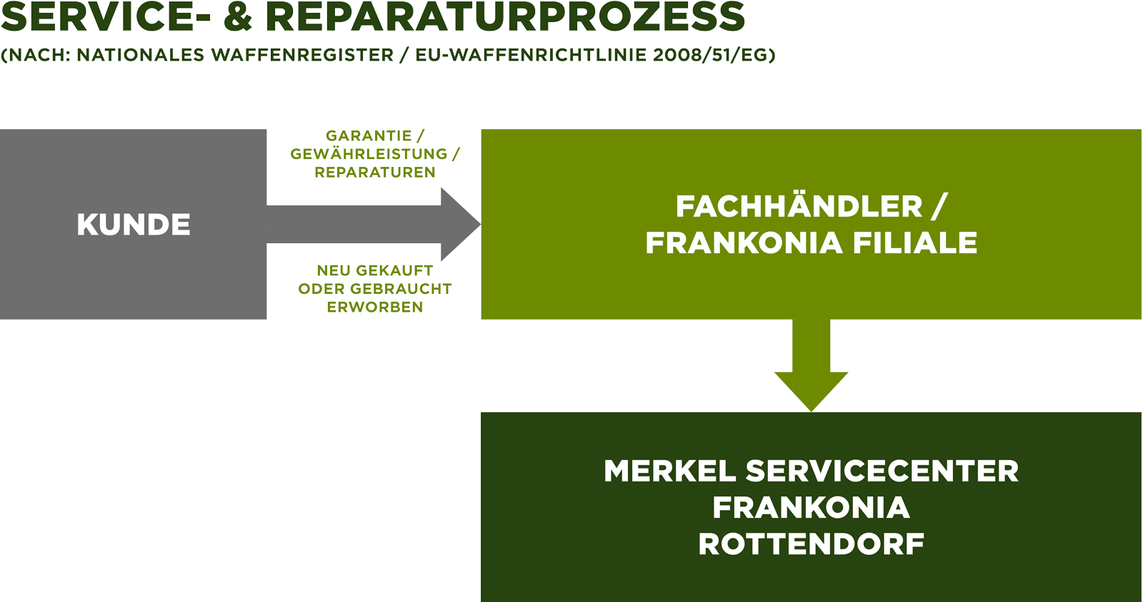 Merkel hat zusammen mit Frankonia das Merkel Servicecenter Frankonia Rottendorf gegründet. Dieses Servicecenter wickelt alle Garantie-, Service- und Reparaturaufgaben für Merkel Gewehre kompetent ab. Über das Fachhandelsnetz und die Frankonia-Filialen ist sichergestellt, dass Gewehre einfach, rechtssicher entgegengenommen und rückversendet werden können. Vorsicht: Ein Einsenden ins Werk Suhl ist rechtlich nicht zulässig!